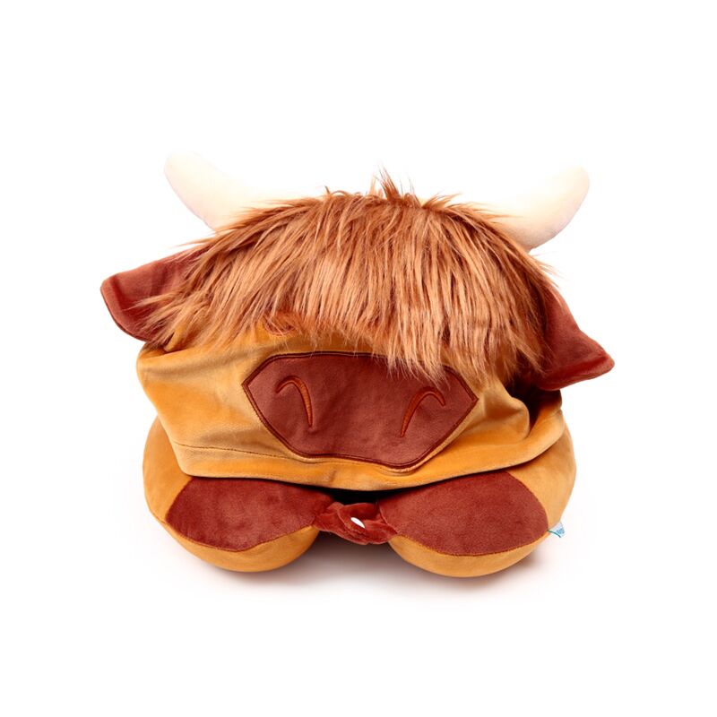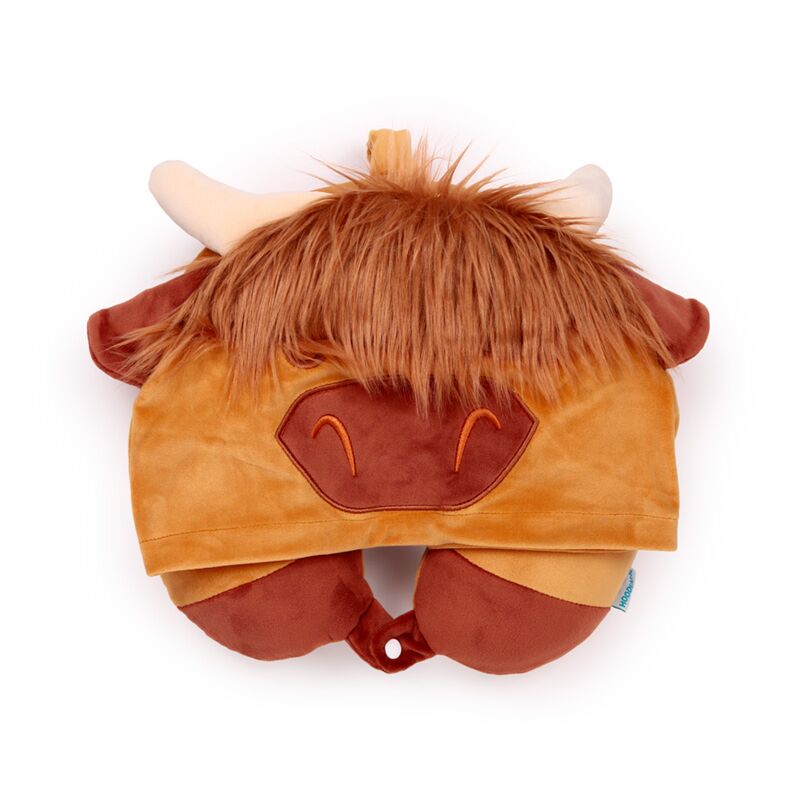 Plyšový cestovní polštář s kapucí Hoodeazzz-Highland Coo-Kráva